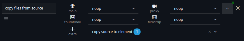 We want to run a extra task that copies files from the source location to the main element. When re-rendering a elements media the main task will not be executed. The proxies jobs will be executed before the extra task. That’s why we need to set the other proxies tasks to a noop task. Otherwise it will show an error that no transcoding template is defined.