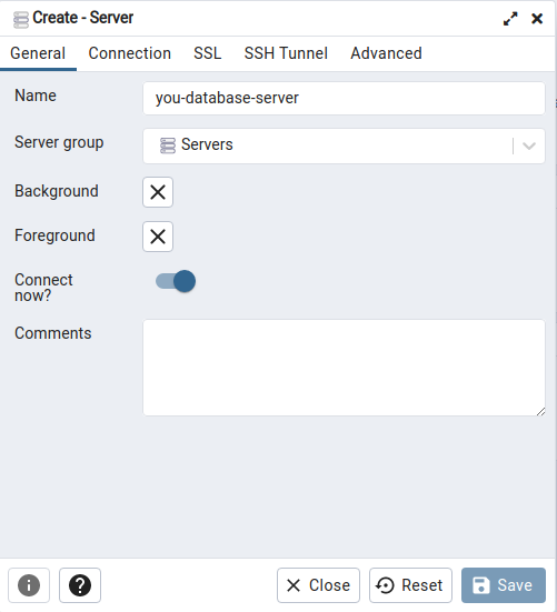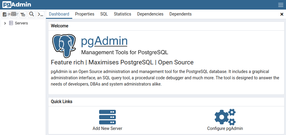 If you prefer a graphical user interface, use the tool pgAdmin4 to view & edit your Database. You can install the software on any workstation to access the Database server. When you start the application for the first time you have to set an master password - it’s only for your local workstation to access pgAdmin4.
