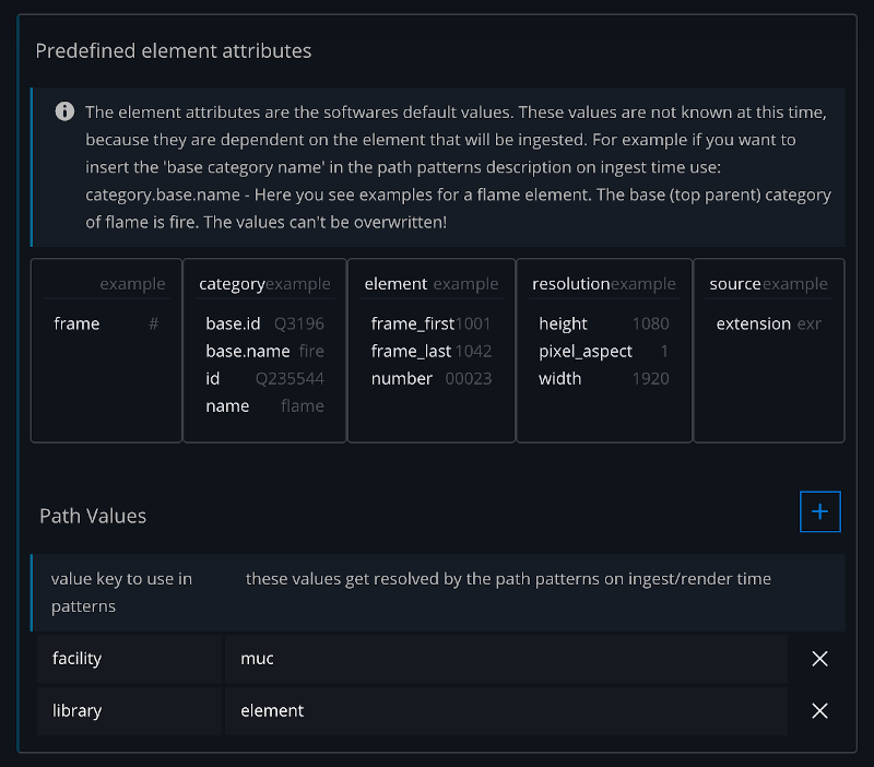 Path values are used to resolve the values of the path patterns depending on the element that will be ingested or rendered. Some values are known once we actually know the data that we want to ingest, others values can be set by you (custom values). The custom values can be overwritten in the library and the transcoding templates.