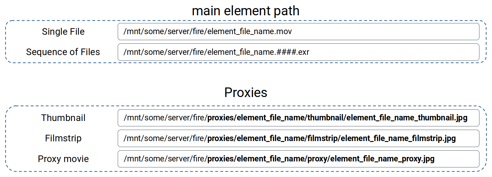 For the proxy files we define a base path that controls the folder structure and naming convention for the proxy files. Depending on the proxy type we will overwrite a custom path value called proxy_type and the file extension. Again this will be a custom path value called: extension.