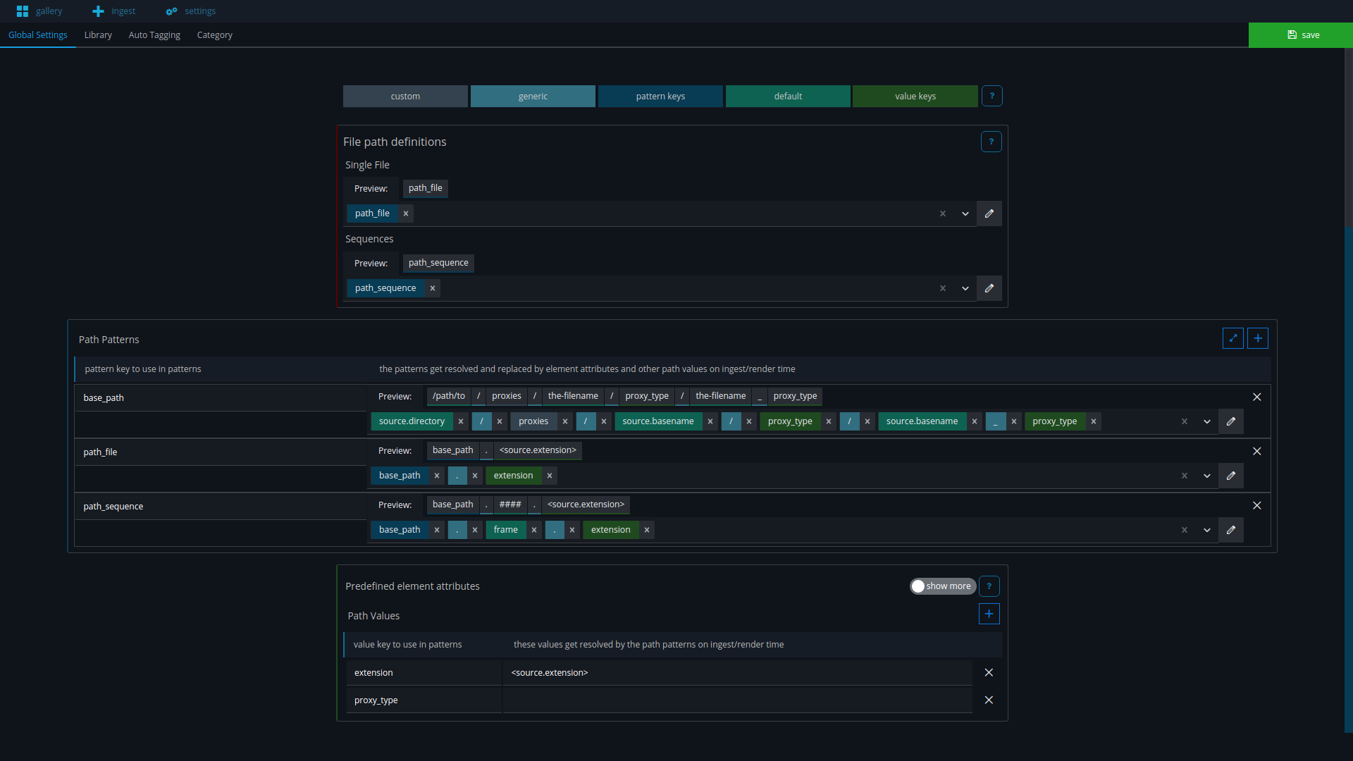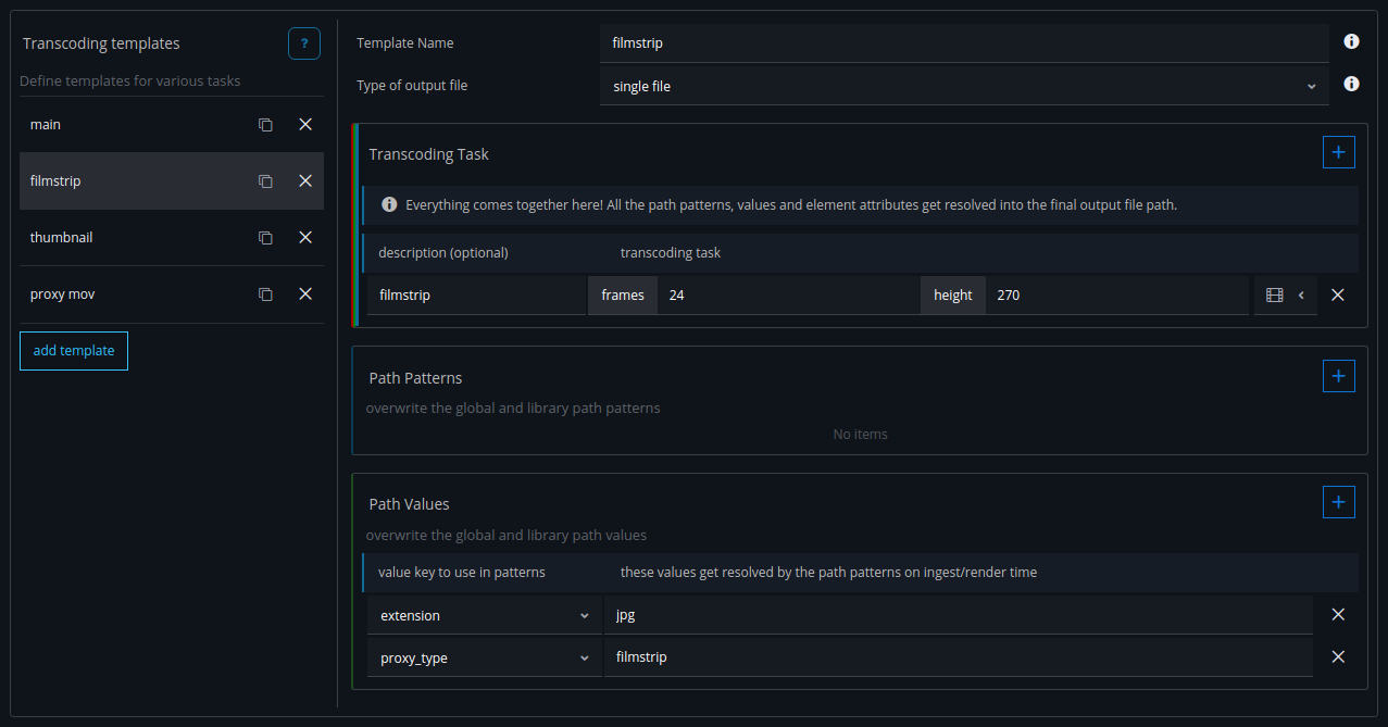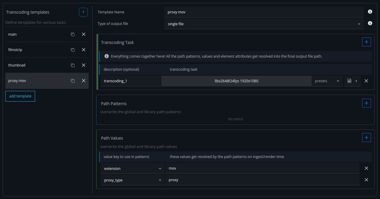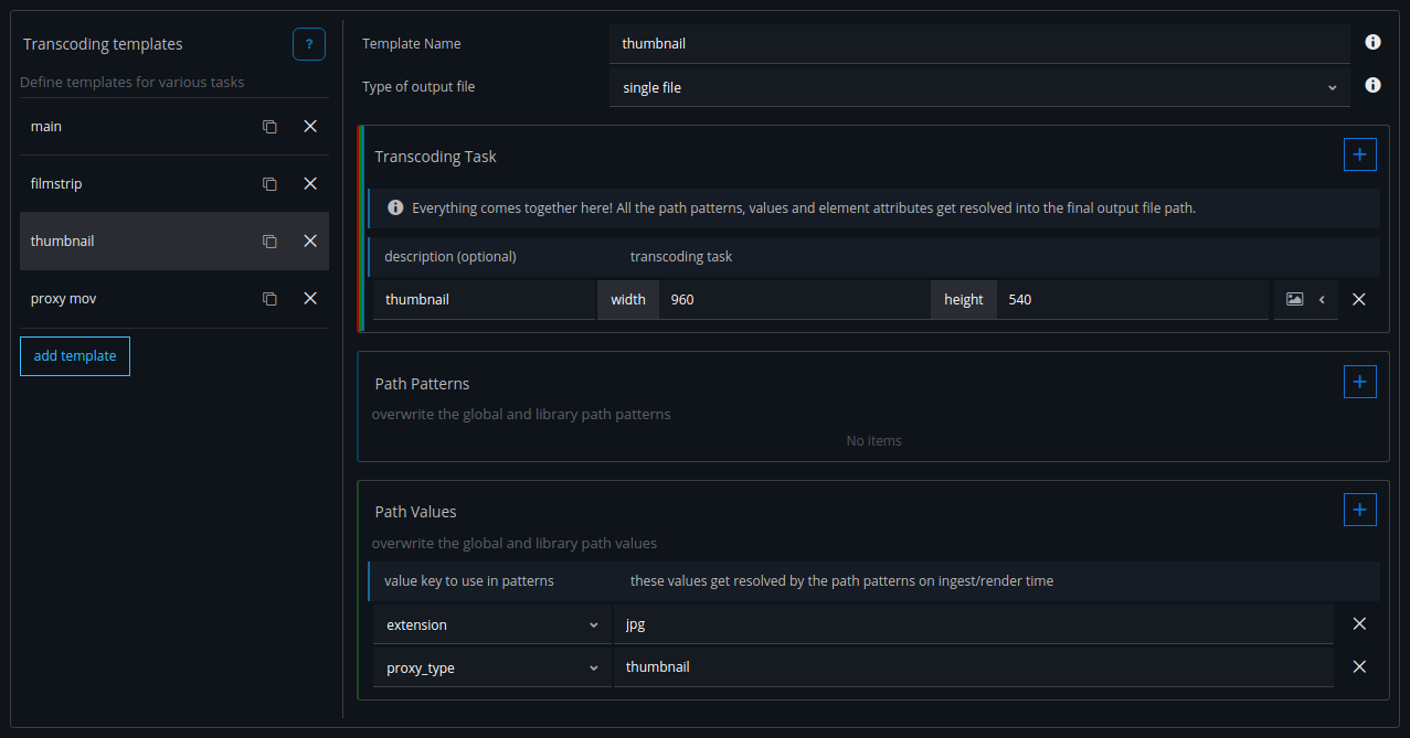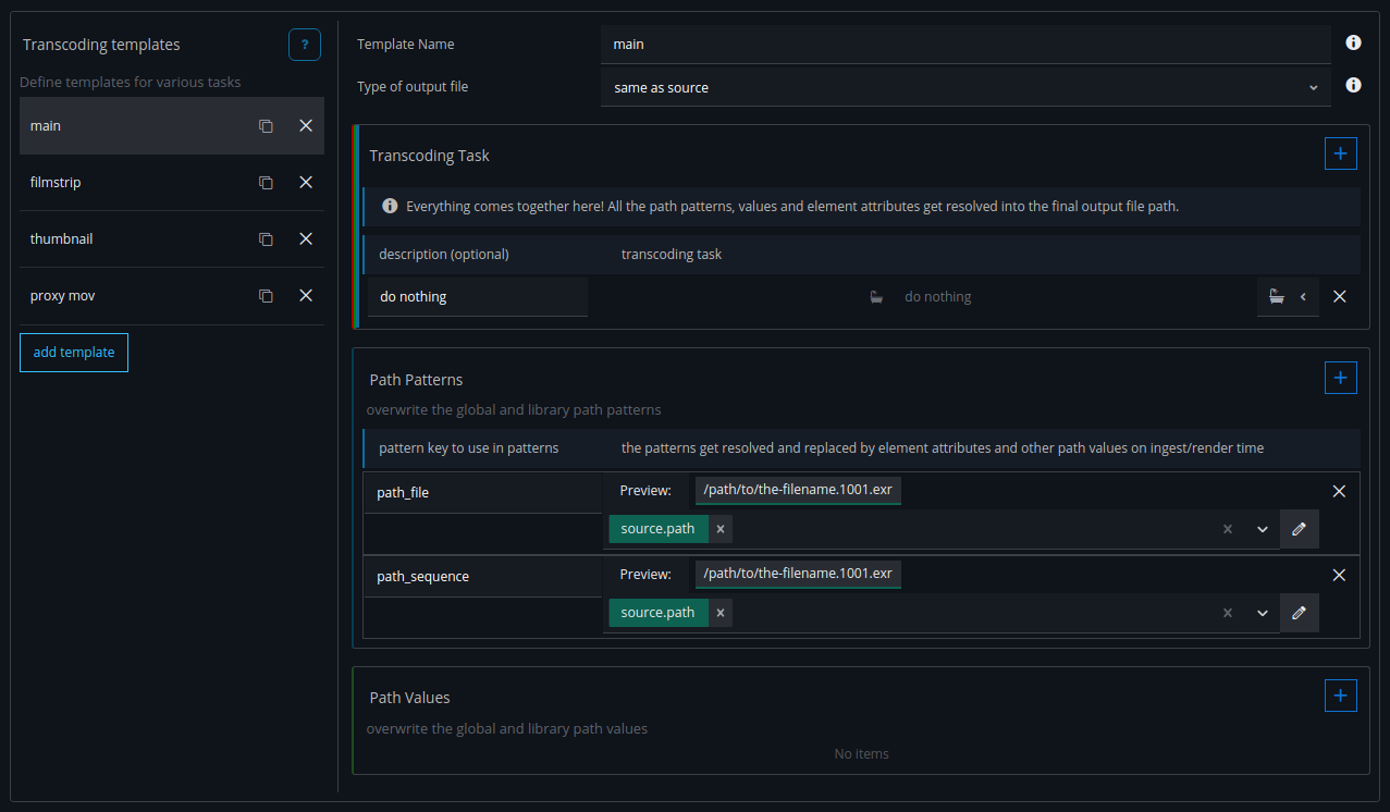 For the file path definitions we will create two placeholder path patterns. These will get overwritten for the main element in the transcoding tasks of the library with the actual path of the main file(s) of the element.